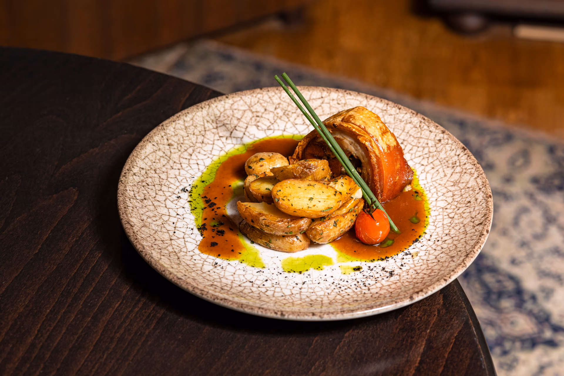 Porcellino malacsült rozmaringos burgonyával és pecsenyelével