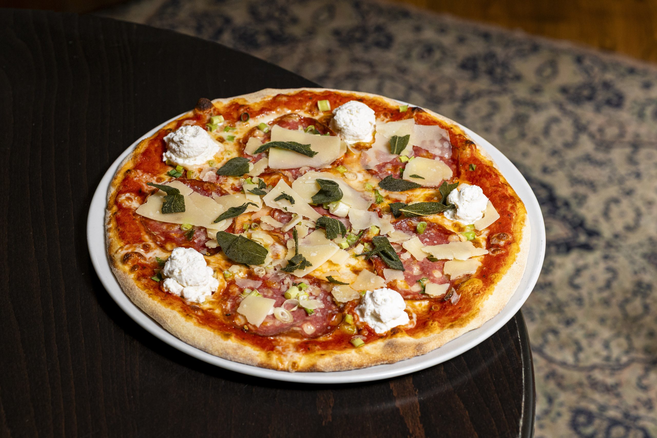 Tomato, mozzarella, parmesan, Neapolitan salami, sping onions, ricotta, sage leaves
